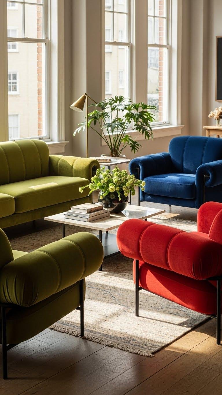 If your jewel-toned velvet piece anchors the room, bulbous sofas and accent chairs take that confidence and bend it into friendly, sculptural form. You’ll love how rounded silhouettes and plush proportioning invite lounging without stiffness.