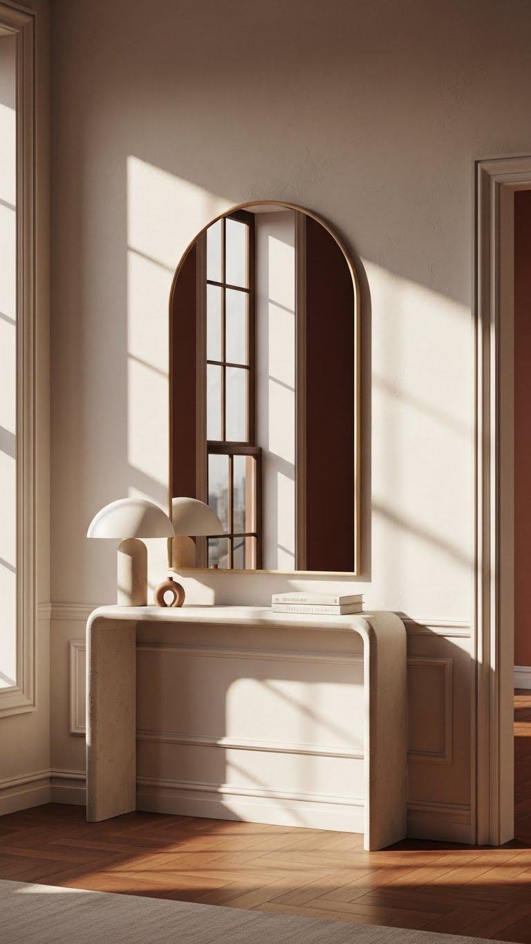 Lean into arches to add instant poise and architectural interest—arched mirrors and mouldings lift a room with sculptural lines that read both classic and contemporary. You’ll choose arched frames to reflect light, elongate sightlines, and create a liberated, gallery-like calm.