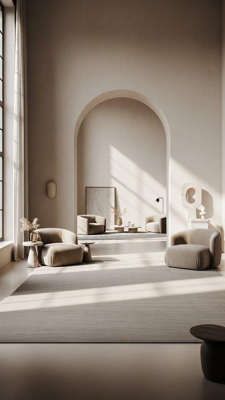 Arches give a room sculptural focus, and a solid-colored large rug will ground that elegance while keeping the visual language calm. You’ll choose oversized textures that feel luxurious underfoot, creating a foundation for tonal layering without clutter. Stick to generous scale and restrained hues so each piece breathes, letting your space feel liberated, cohesive, and effortlessly expensive.