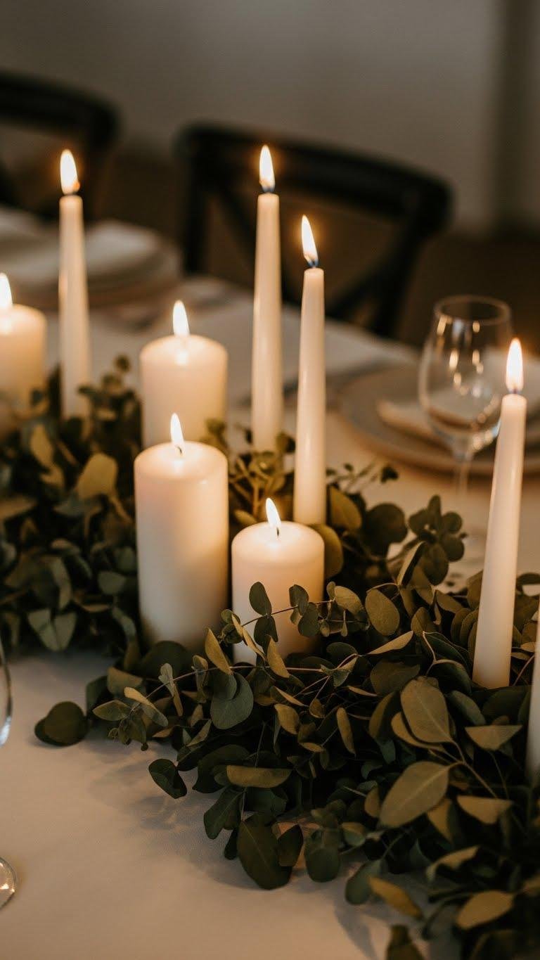 When you group candles of varying heights, you create an instantly modern, layered centerpiece that feels both intimate and effortless. You’ll pair staggered tapers with low-slung preserved eucalyptus, letting texture and shadow do the talking. Keep lines clean, colors muted, and placements loose so you can move pieces freely. This minimal, confident approach feels curated, not contrived—perfect for relaxed, romantic evenings.