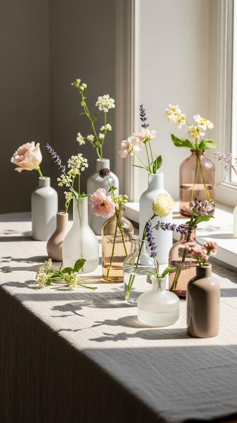If you love the warm, layered feel of grouped candles, try echoing that gathered look with an assortment of small vases instead. You’ll create mini budvase clusters that feel intentional, free, and modern. Mix heights, finishes, and blooms for textured budvase arrangements that read collected-not-contrived. Place them along a table runner or windowsill to keep the vibe airy and effortless.