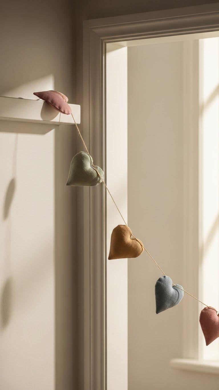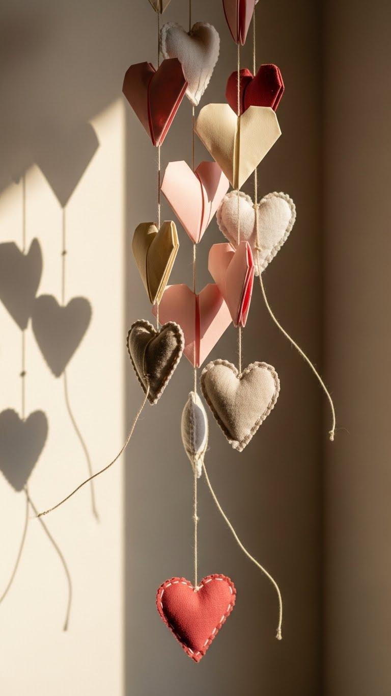 Carry the same handcrafted charm from those keepsake place cards into hanging accents that add motion and warmth—DIY paper and fabric heart mobiles are an easy, modern way to dress a room for Valentine’s.