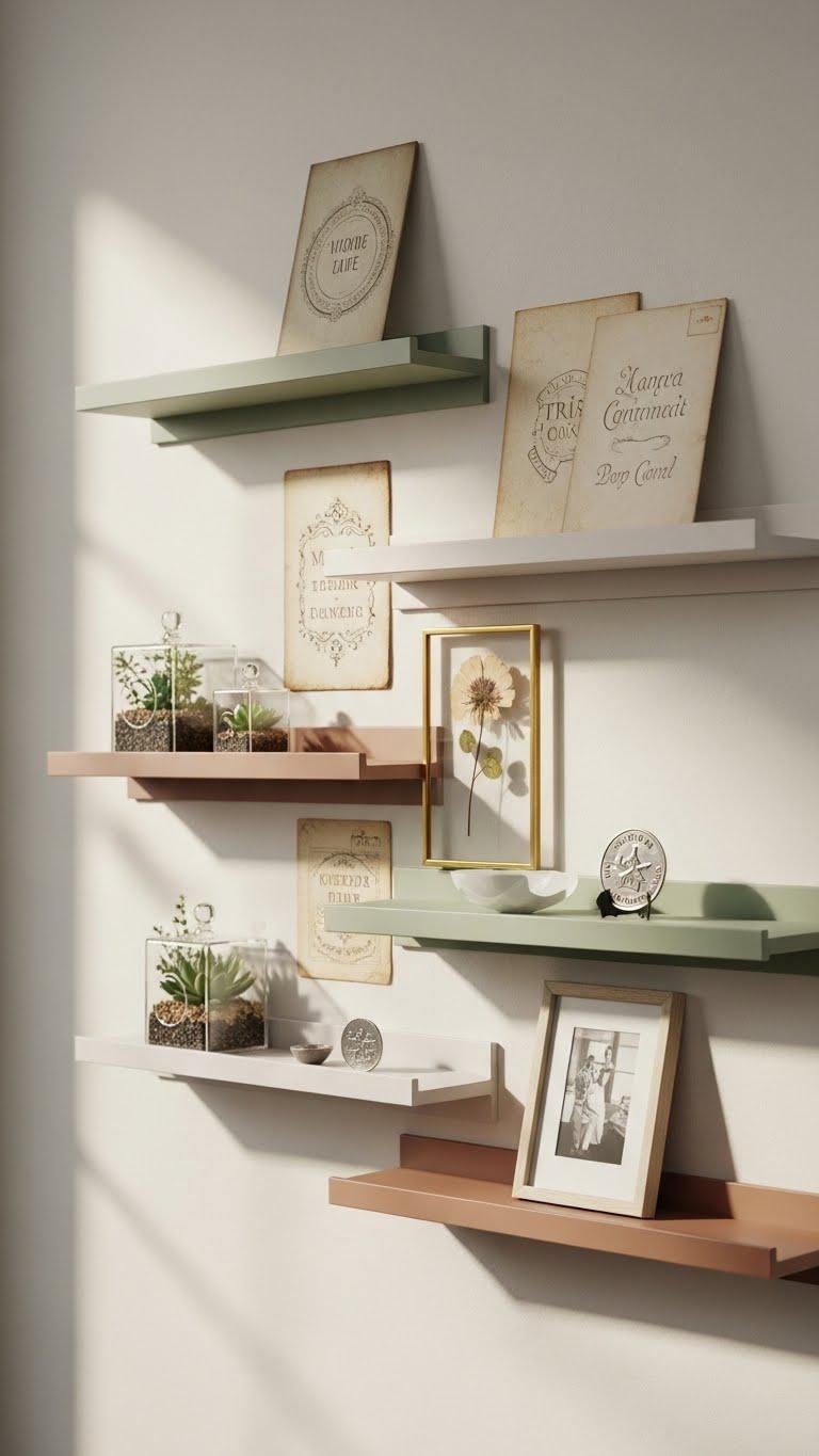 Arrange a few slim floating shelves and curate them with small, meaningful objects that read like a visual love letter. You’ll mix vintage bookplates, miniature terrariums, a pressed flower, a travel token, and a favorite photo in simple frames. Keep spacing airy, colors muted, and pieces personal so the display feels open, intentional, and effortlessly romantic without clutter.