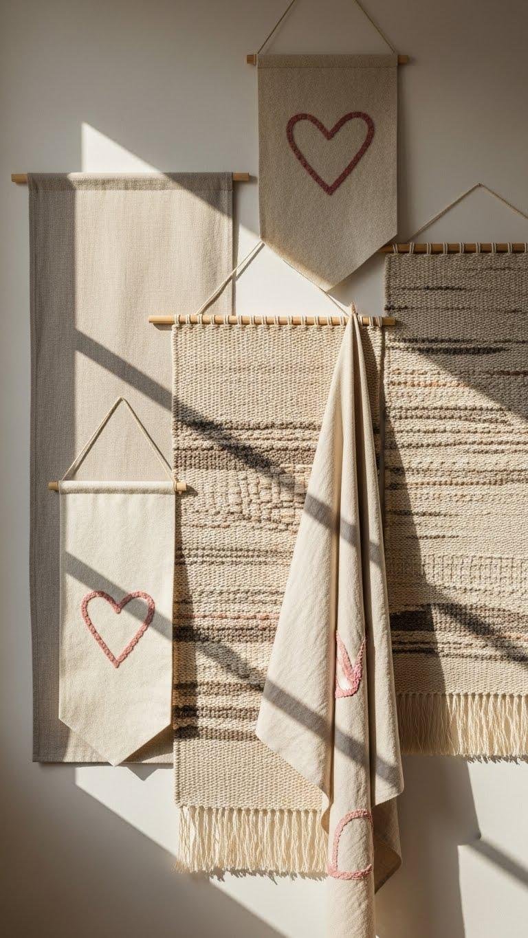 Bring warmth to a blank wall with fabric hangings that whisper romance—think linen panels, woven tapestries, or felt banners embroidered with subtle heart motifs.