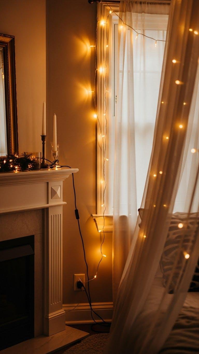 Often you’ll find that a string of warm white fairy lights instantly softens a room, turning ordinary corners and mantels into intimate, glowing nooks. You’ll embrace warm drape installations over windows or beds, creating subtle privacy without fuss. Try twinkle canopy arrangements above a seating area for liberated, cozy vibes. Keep cords tidy, dimmers handy, and enjoy a calm, modern romance.