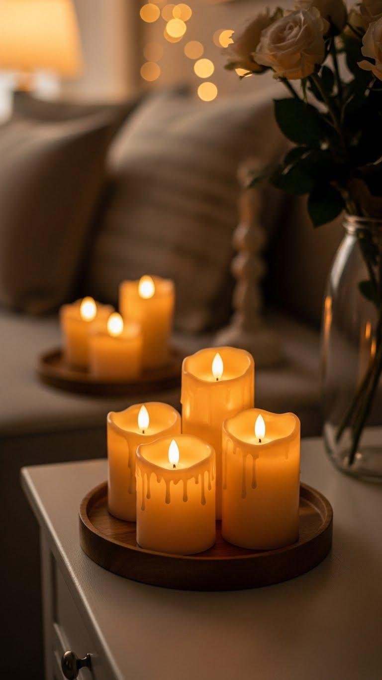 Battery-operated flameless candle clusters give you the same warm, flickering glow without the fuss or fire risk, so you can relax into Valentine’s ambiance anywhere in your home. Arrange battery candles in small groupings on trays, mantels, or bedside tables to create intimate pockets of light.