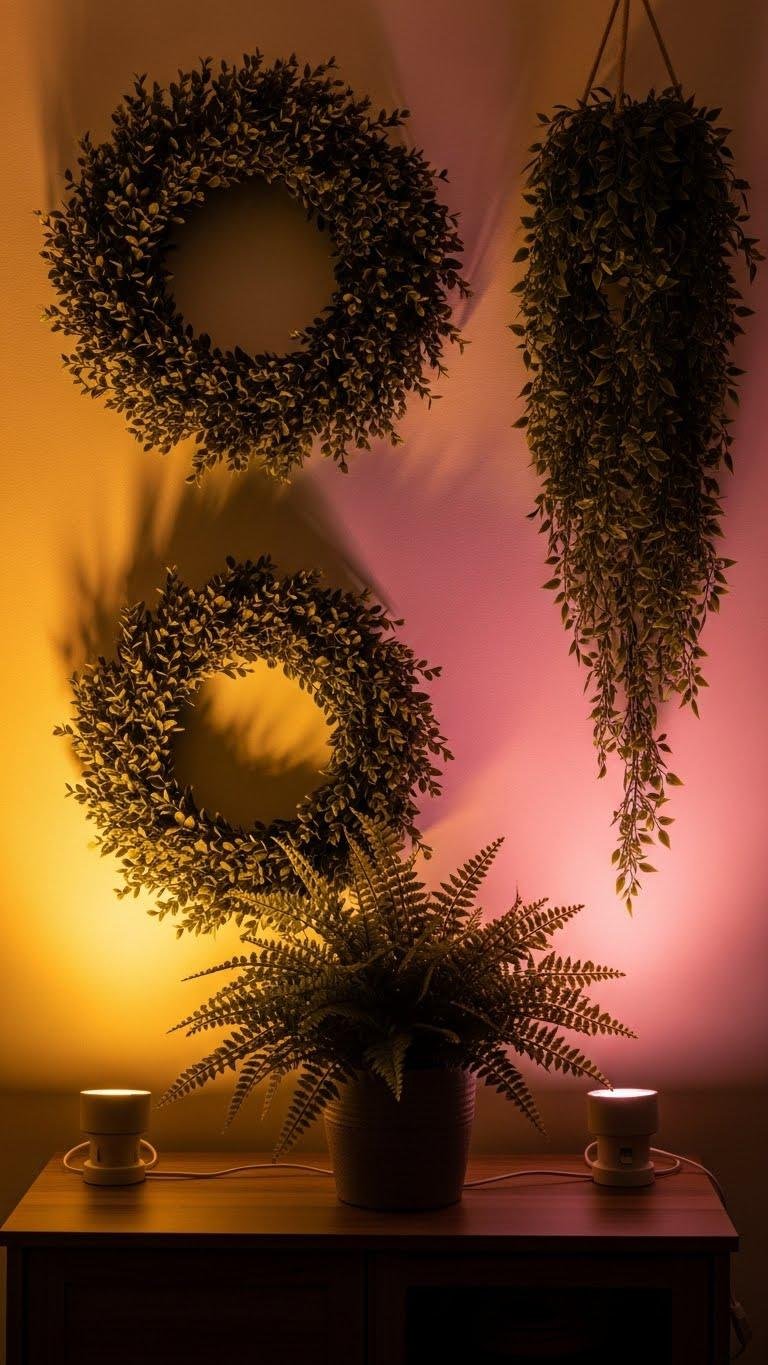 Placing soft uplighting behind a wreath, potted fern, or cascading garland instantly elevates it into a focal point, so your greenery becomes a living backdrop for Valentine’s accents. You’ll use subtle mood washes to shift tone—warm amber for intimacy, soft pink for playfulness—casting crisp foliage silhouettes on walls. Position fixtures low and hidden so light feels effortless and liberating. the background, generous negative space between lanterns to emphasize breathing room; color palet