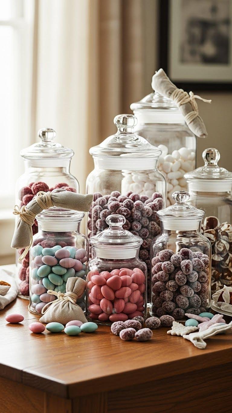 Bring together sweetness and style by filling apothecary jars with seasonal treats—think heart-shaped candies, pastel Jordan almonds, sugared cranberries, or mini truffles—so they double as decor and delightful snacks. You’ll arrange jars of varying heights as a seasonal apothecary vignette, add tied herbal sachets for layered scent, and let guests help themselves, keeping the look effortless and free-spirited.