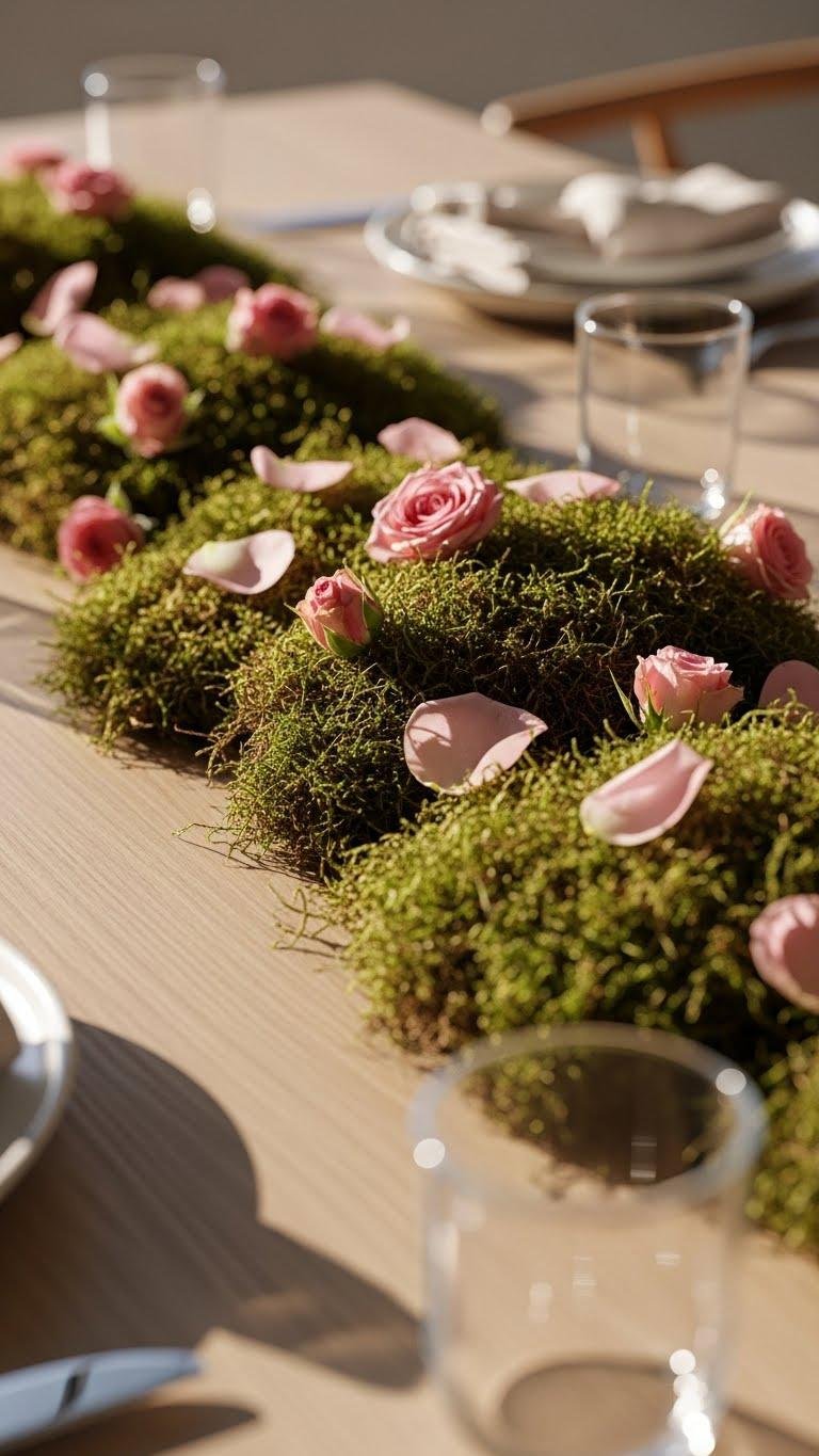 Often you’ll anchor a table with low greenery mats topped with scattered rosebuds to create a fresh, modern Valentine’s look that’s low-profile and intimate. You’ll layer rustic moss for texture, tuck in delicate petals for soft color, and keep heights minimal so conversation flows. Opt for loose, unstructured arrangements that feel free, unfussy, and effortlessly romantic without competing with your tableware.