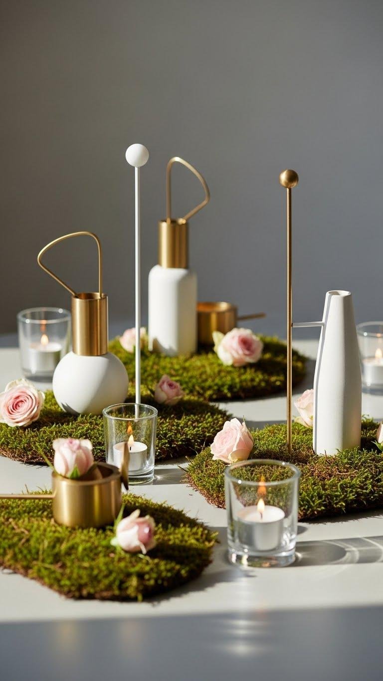 After grounding your table with low moss mats and scattered rosebuds, introduce a few minimal sculptural accents to add visual interest without crowding the space. Choose minimalist sculptures in brass or matte ceramic, pairing one or two pieces with small votives. Lean into clean lines and geometric accents to keep the arrangement airy, letting each object breathe so your setting feels intentional and free.