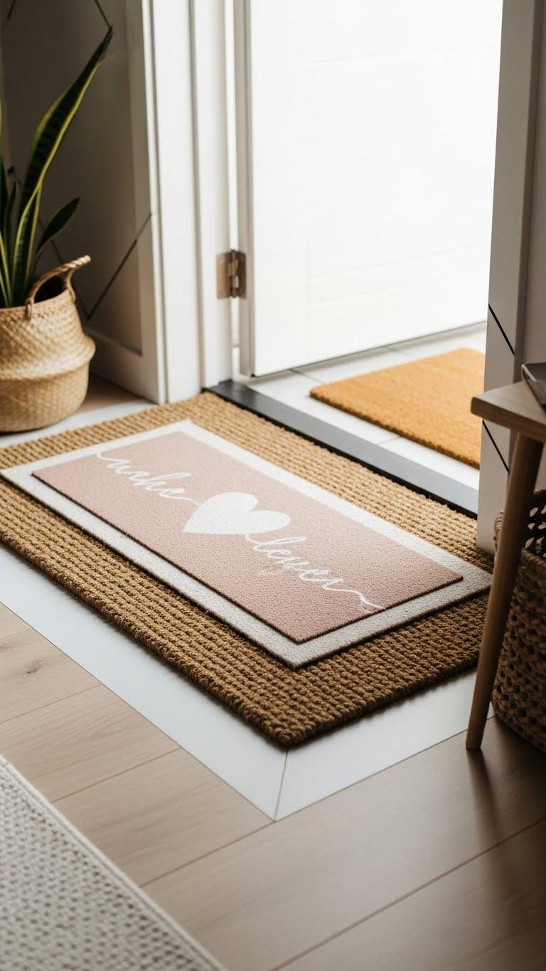 When you layer doormats for Valentine’s, aim for contrast and calm—pair a neutral base (think coir or woven jute) with a slim top mat in muted blush or soft script so the look feels intentional, not cluttered.