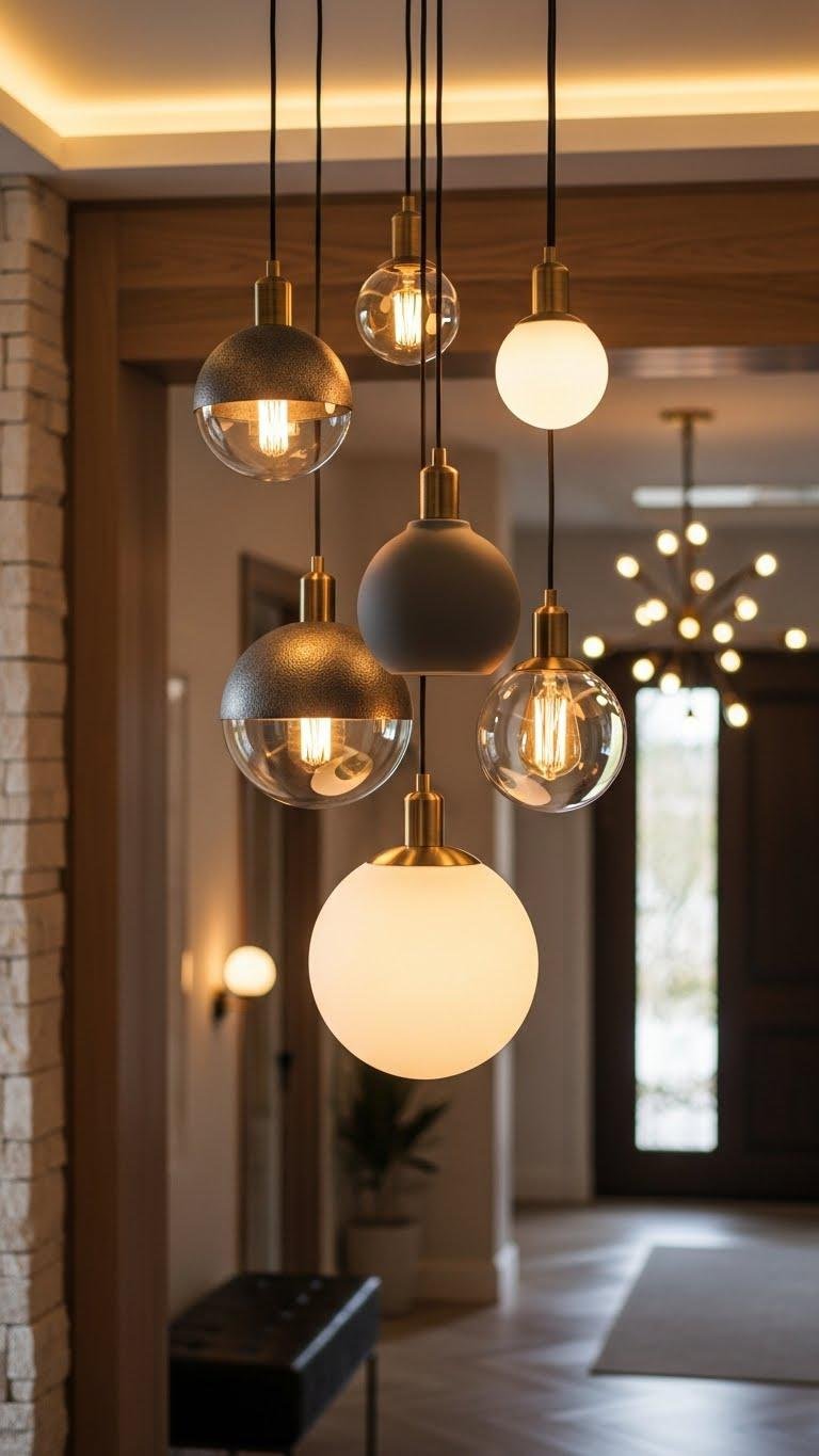 Mix and match pendant heights and finishes to give your foyer an artful, layered glow that feels modern and welcoming. Choose textured pendants for tactile interest and pair clear or frosted glass for layered translucency. You’ll create a freeing, gallery-like entry without excess. Keep cords neat, stagger bulbs’ warmth, and let the cluster set a subtle, romantic tone that’s stylish and effortless.
