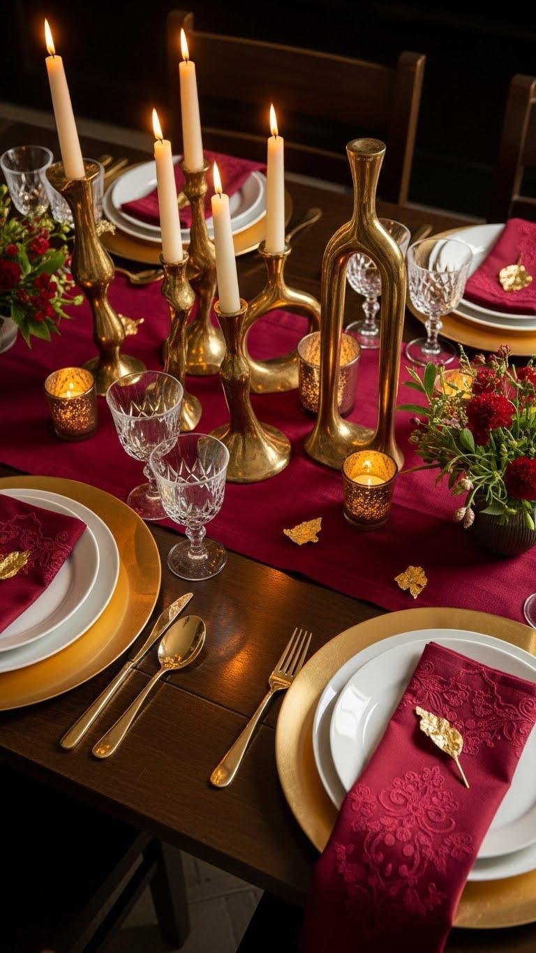 Set a scene that feels decadent without being fussy: start with a deep crimson runner or linen as your foundation, then layer in burnished gold chargers, cut-glass stemware, and sculptural brass candlesticks to catch the light. You’ll add crimson embroidery napkins and subtle gold leafing accents, pairing sleek modern plates and libre floral clusters so your table feels bold, free, and effortlessly luxe.