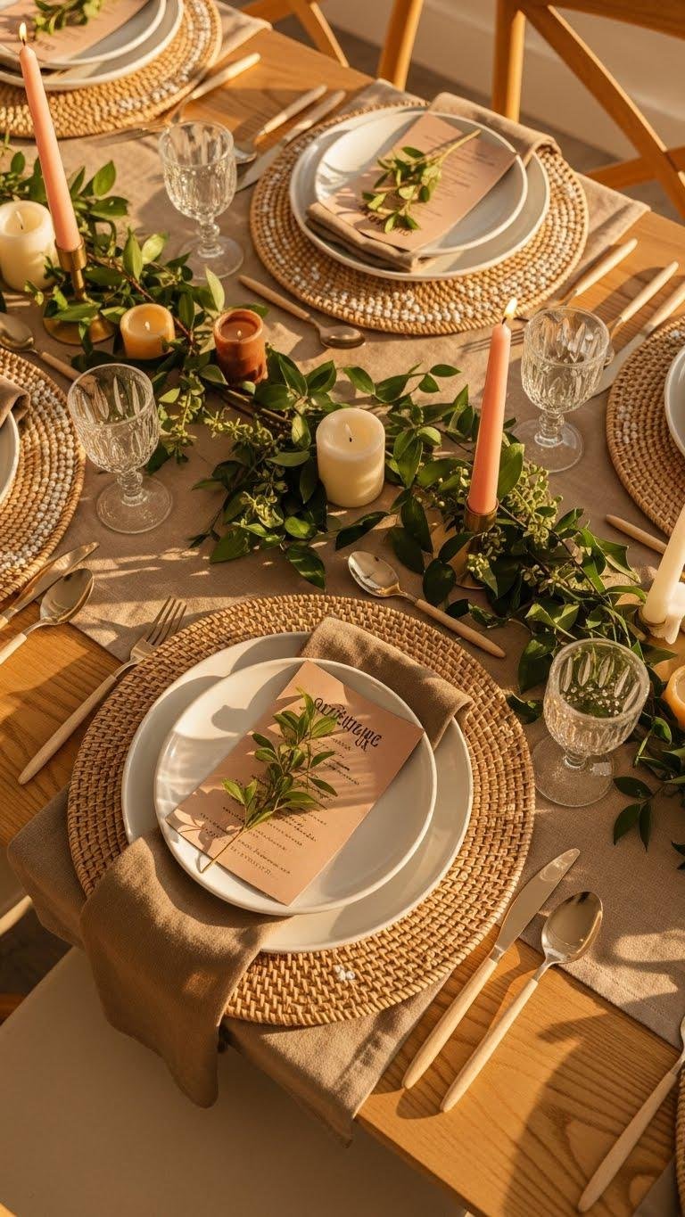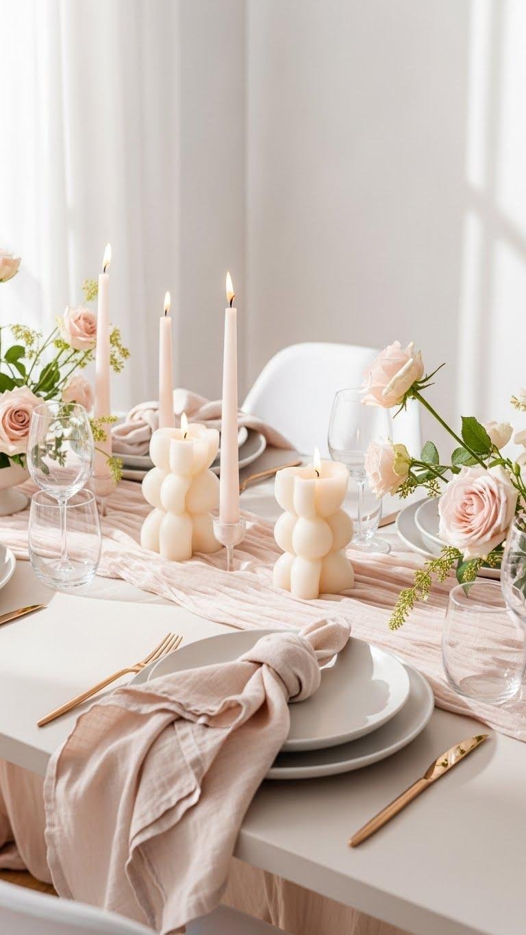 After the drama of crimson and burnished gold, soften the mood with a Blush and Ivory Romantic Setting that feels airy yet intentional. You’ll layer soft blushs linens, gauzy runners and pale blooms against rich ivory textures — matte porcelain, linen napkins, and sculpted candles. Keep lines clean, let light float, and invite a liberated, modern romance that’s quietly confident and effortlessly chic.