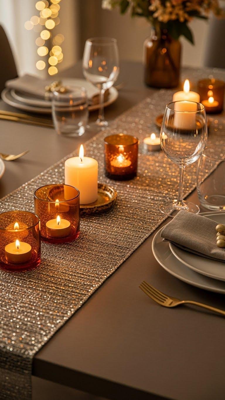 Lay a metallic-threaded runner down the center of your table to catch candlelight and give the setting an immediate, curated sheen.
