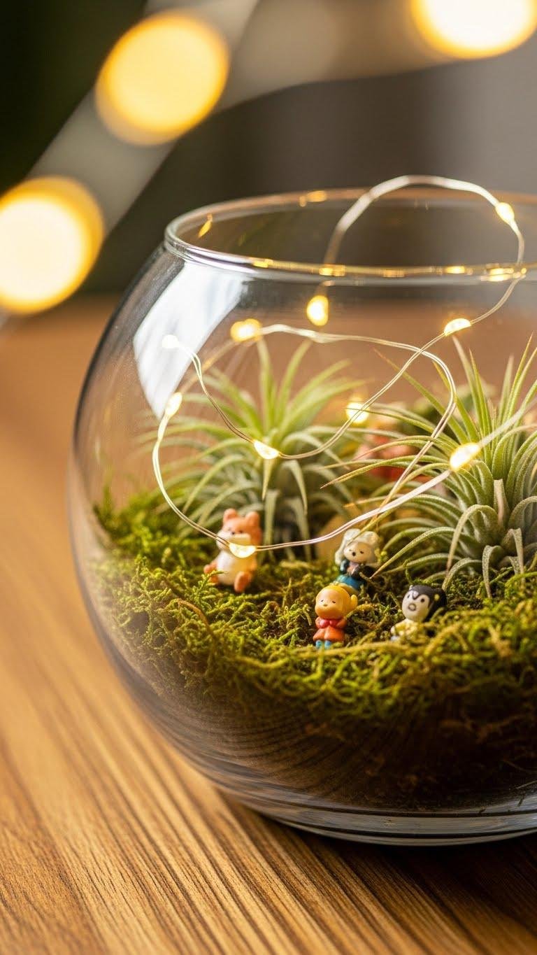 You’ll nestle a moss base, arrange miniature figurines, and tuck air plant accents around a soft LED fairy strand.