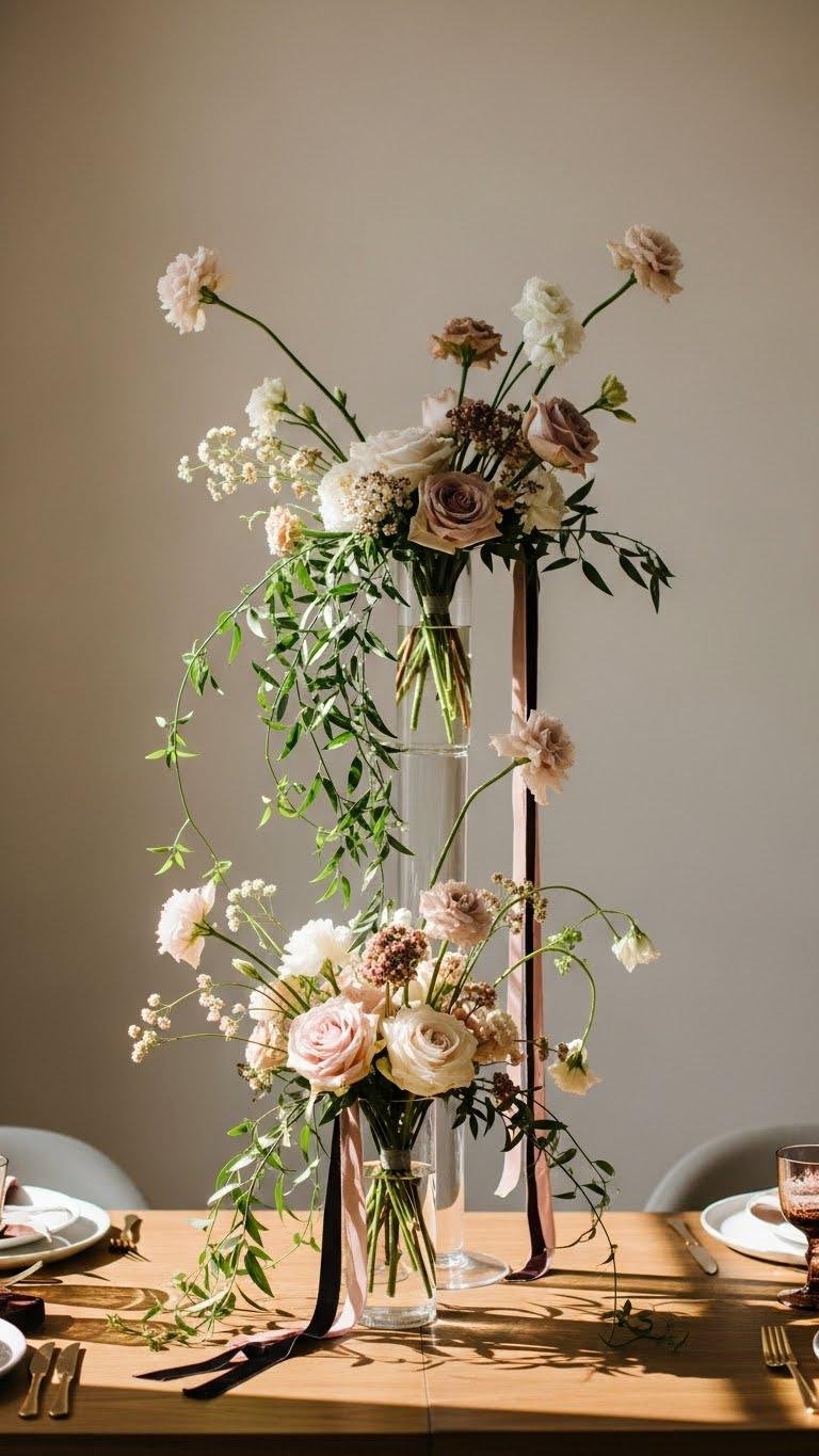 You’ve elevated simple vases with velvet ribbon; now stretch that same sense of drama upward with tall vases overflowing in a gentle cascade. You’ll favor towering arrangements that breathe, combining sculptural stems, soft blooms, and trailing vines. Cascading greenery adds movement and a liberated, modern romance—minimal fuss, maximal statement—letting the table feel open, bold, and effortlessly seductive.