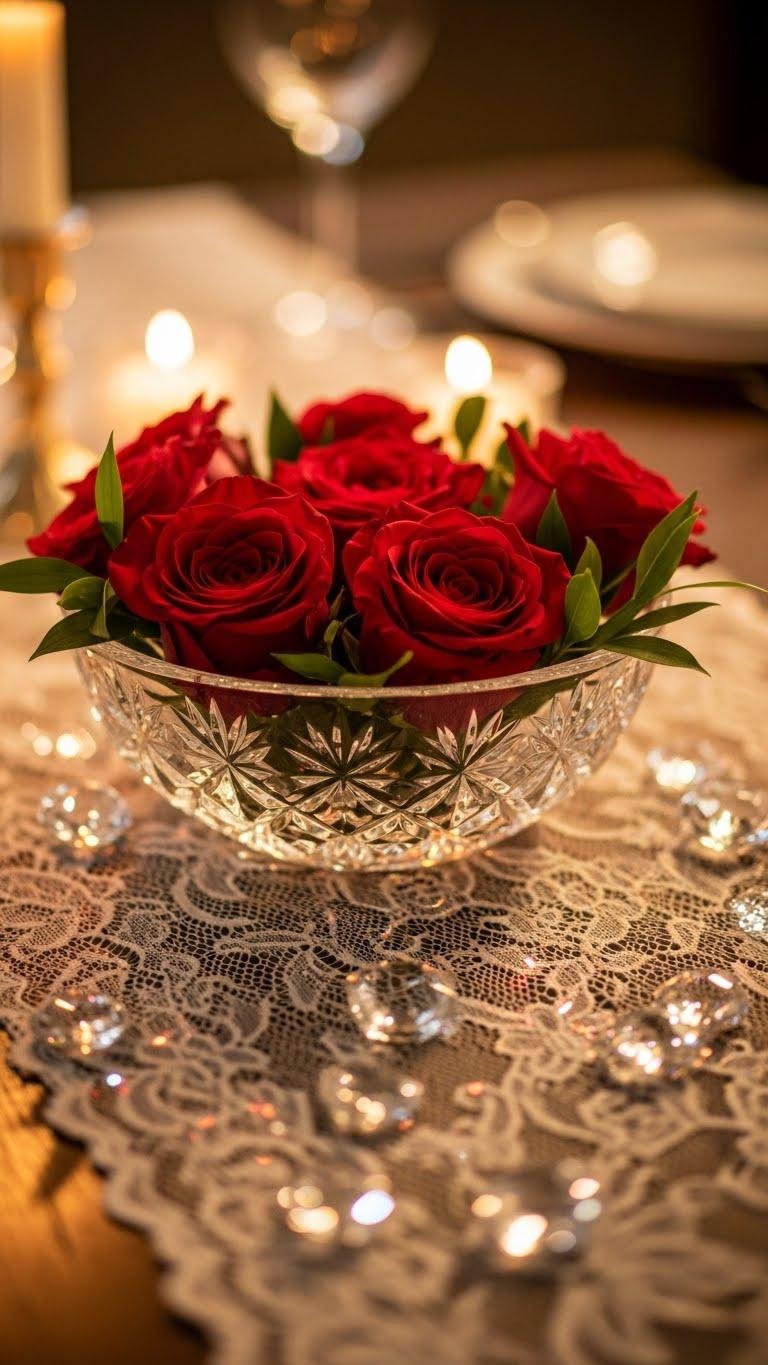 Let the lace runner’s warm candlelight meet a bold burst of red at the table’s heart: a low crystal bowl filled with just-bloomed red roses. You’ll arrange stems casually, letting rosy reflections play across petals while crystal sparkle scatters light. Keep foliage minimal, trim stems low, and trust the uncluttered silhouette—it’s effortless, luxe, and frees your table to breathe and flirt with glow.