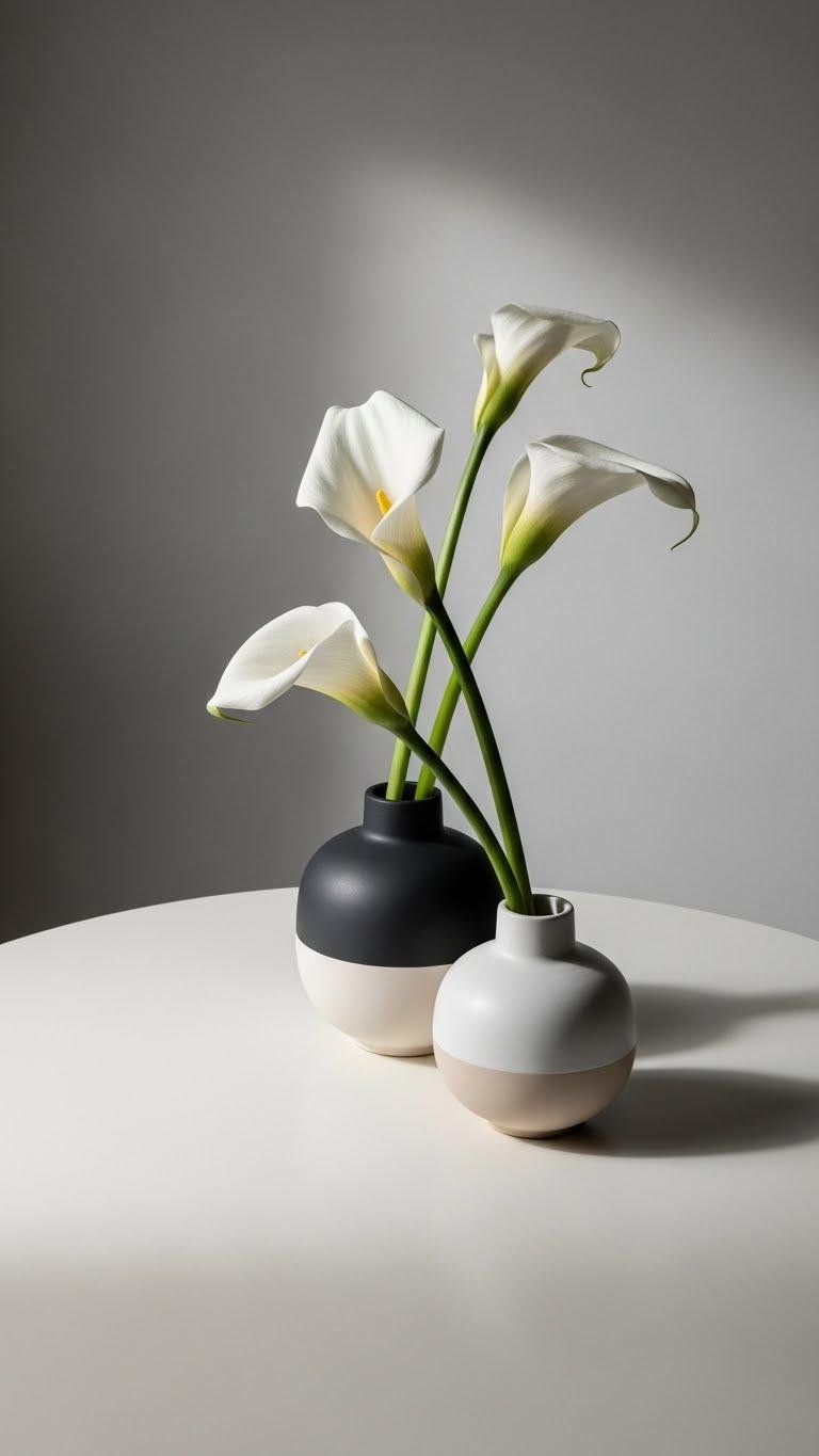 Though minimal at first glance, a calla-lily centerpiece makes a bold, modern statement that feels both sculptural and effortlessly chic. You’ll arrange minimalist stems in low matte vases, embracing a monochrome palette that frees the eye.