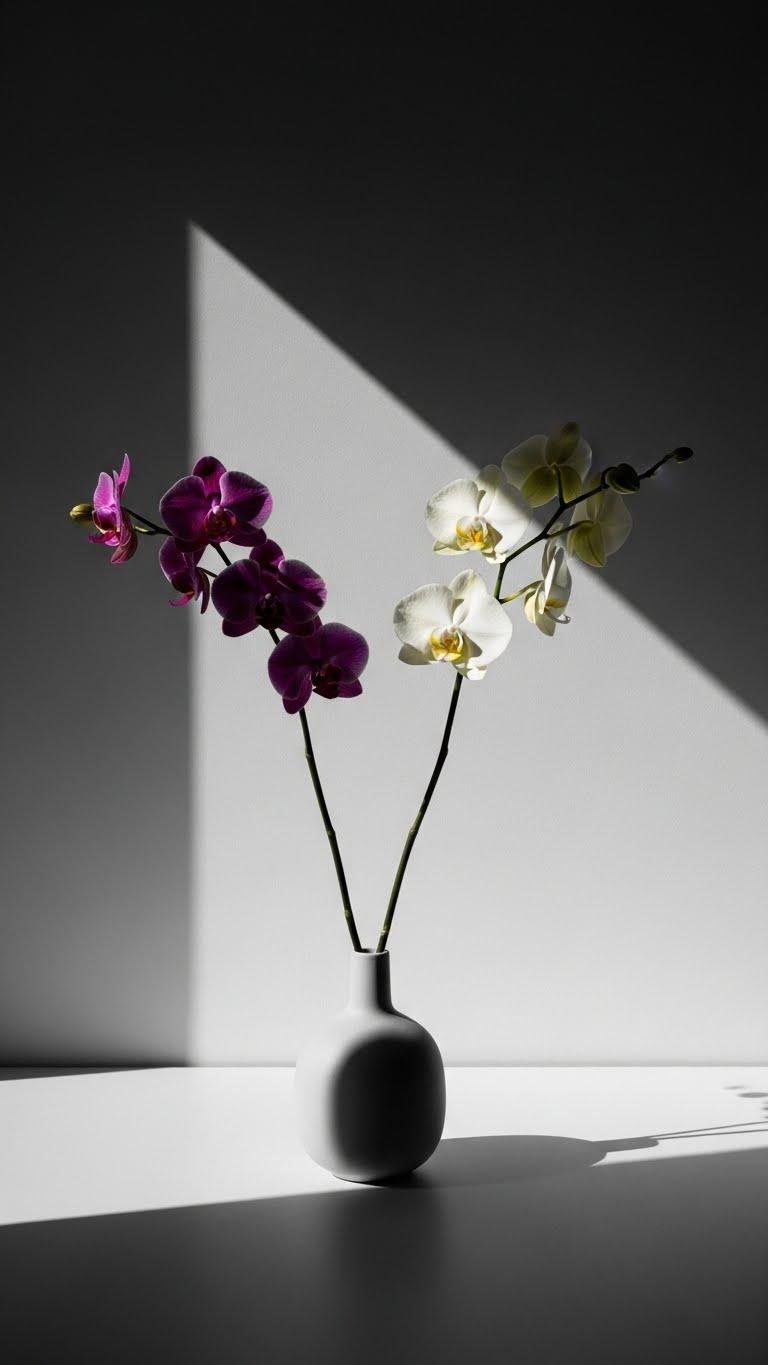 You choose a monochrome orchid in deep plum or ivory, place stems in a minimalist vase, and let stark contrast anchor the table. Clean lines meet soft petals for an elegant textural pairing that feels liberated, modern, and quietly magnetic without excess.