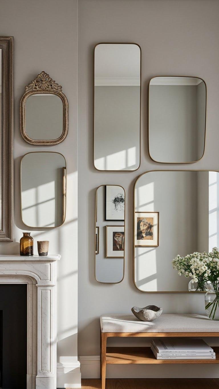 You’ll catch light and expand a room’s sense of space by arranging mirrors at different sizes, shapes, and depths; when placed thoughtfully, they act like a curated constellation that reflects light, architecture, and artwork.