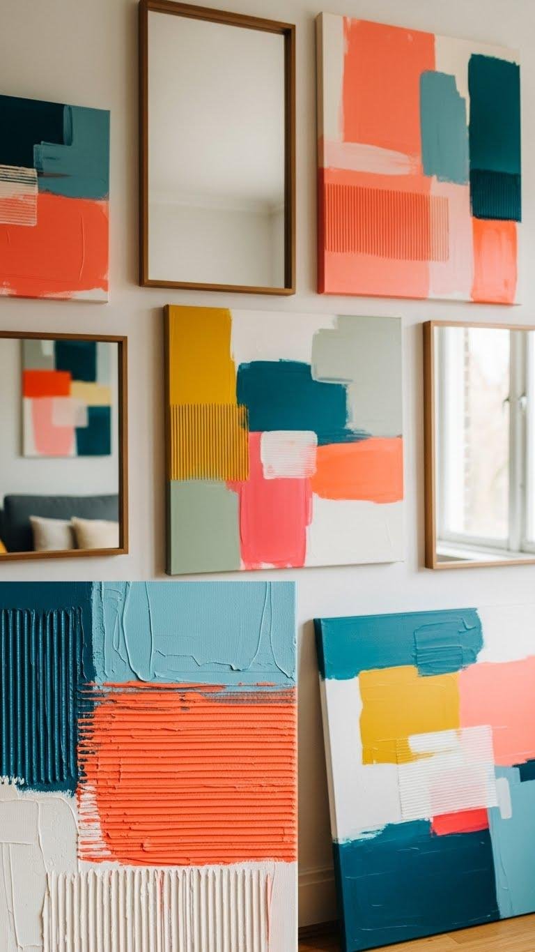 Mirrors can amplify light and depth, but handmade canvas paintings bring personal color and texture that anchor a room. You’ll mix bold color blocking with layered abstract textures, choosing palettes that reflect your mood. Paint confidently, embrace imperfect strokes, and scale pieces to suit walls.