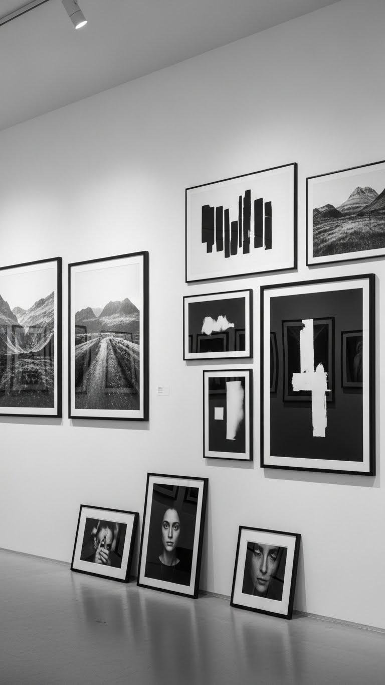 Curate contrast studies and timeless portraits in varied scales, mix bold negatives with intimate close-ups, and keep frames minimal to let images breathe.