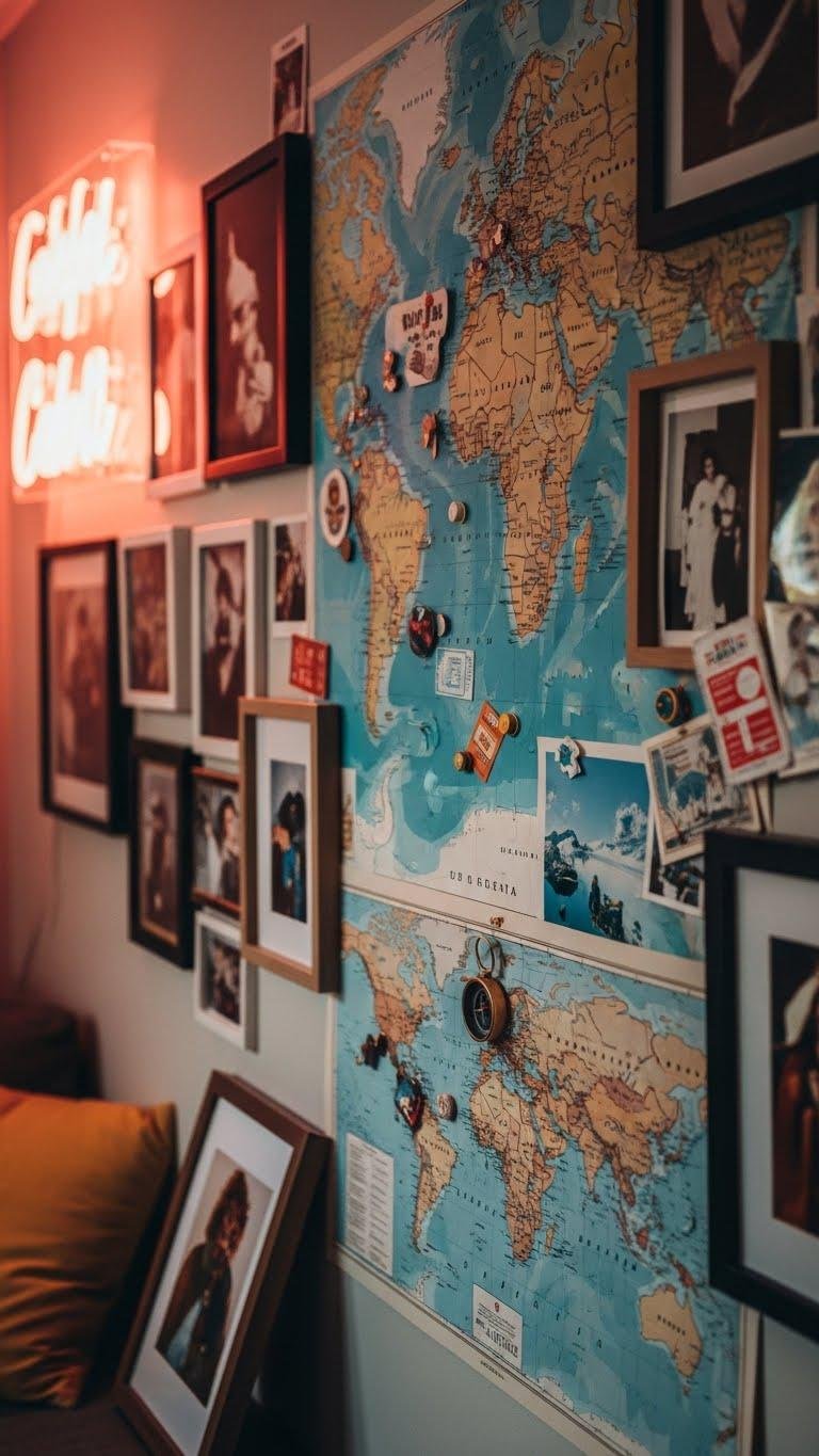 After neon signs set the mood, map art and travel memory walls let you tell stories on the same plane—curate routes, pin favorite cities, and display souvenirs so the wall reads like a lived-in scrapbook. Use vintage maps as bold backdrops, mix framed photos and postcards, and anchor moments with Travel pins. You’ll craft a liberating, personal gallery that invites wanderlust daily.