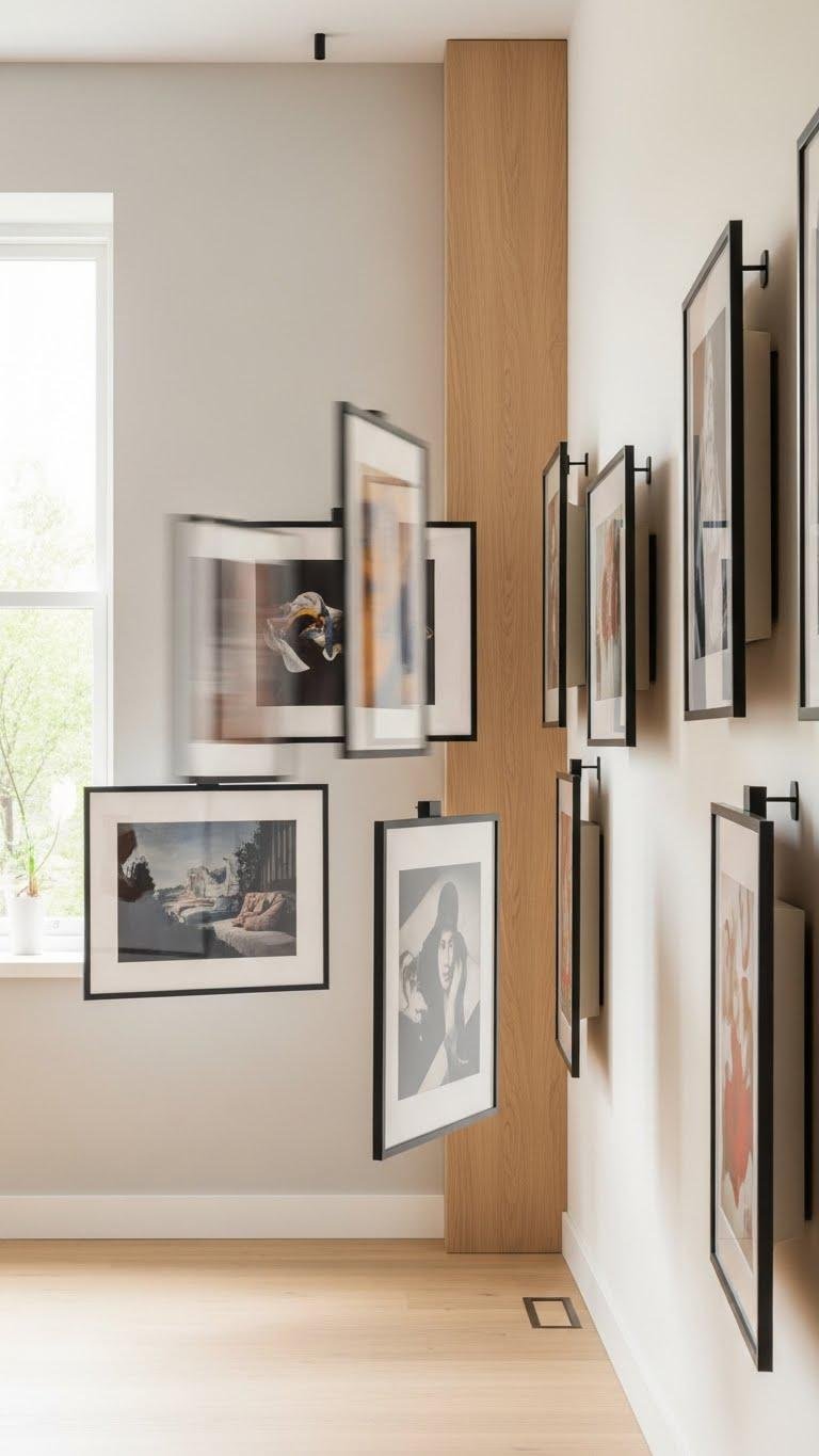 You’ll choose a rotating display with magnetic frames for quick swaps, or a kinetic installation with motorized mounts to automate change. It’s bold, minimal, and liberating — a curated wall that moves with your mood and saves you time.