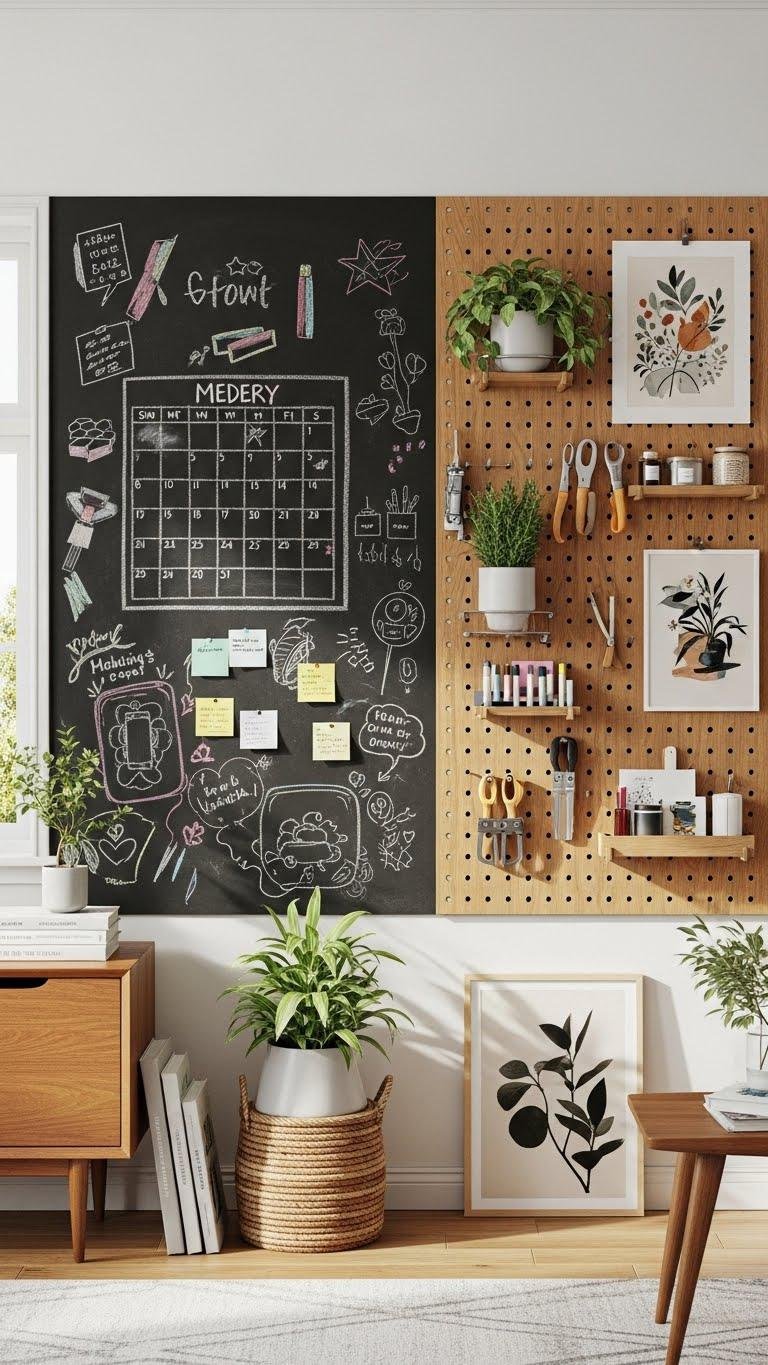 When you swap a static wall for a chalkboard or pegboard, the room becomes a living tool — a place to sketch ideas, organize gear, or rotate displays with effortless flair.