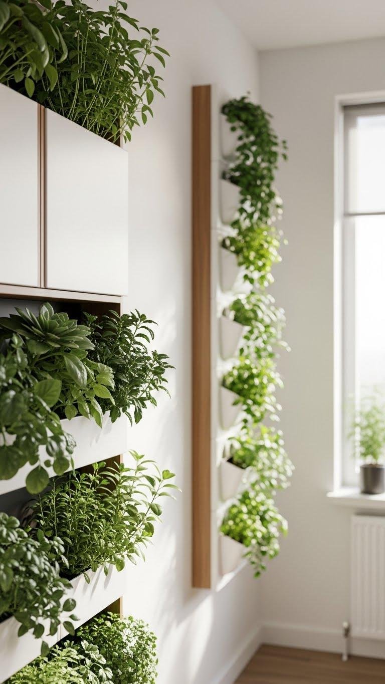 You’ll install a vertical herbwall or sleek narrow planterboard to grow herbs, succulents, or trailing vines.