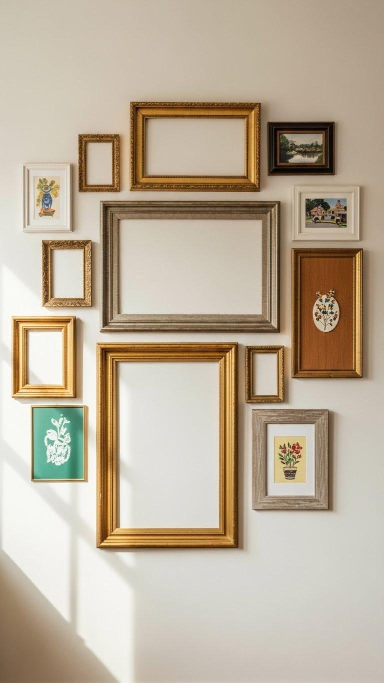 Layer a vintage frame eclectic gallery to turn a blank wall into a curated conversation — mix gilt baroque, midcentury teak, and distressed farmhouse frames in varied sizes and depths for instant character.
