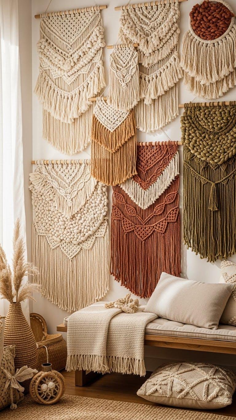 You’ll choose woven textures to soften corners, define zones, or add bohemian rhythm. Mix macramé panels with neutral tones or bold dyes, hang at varied heights, and let each piece breathe — freedom expressed through touch, scale, and simple craft.