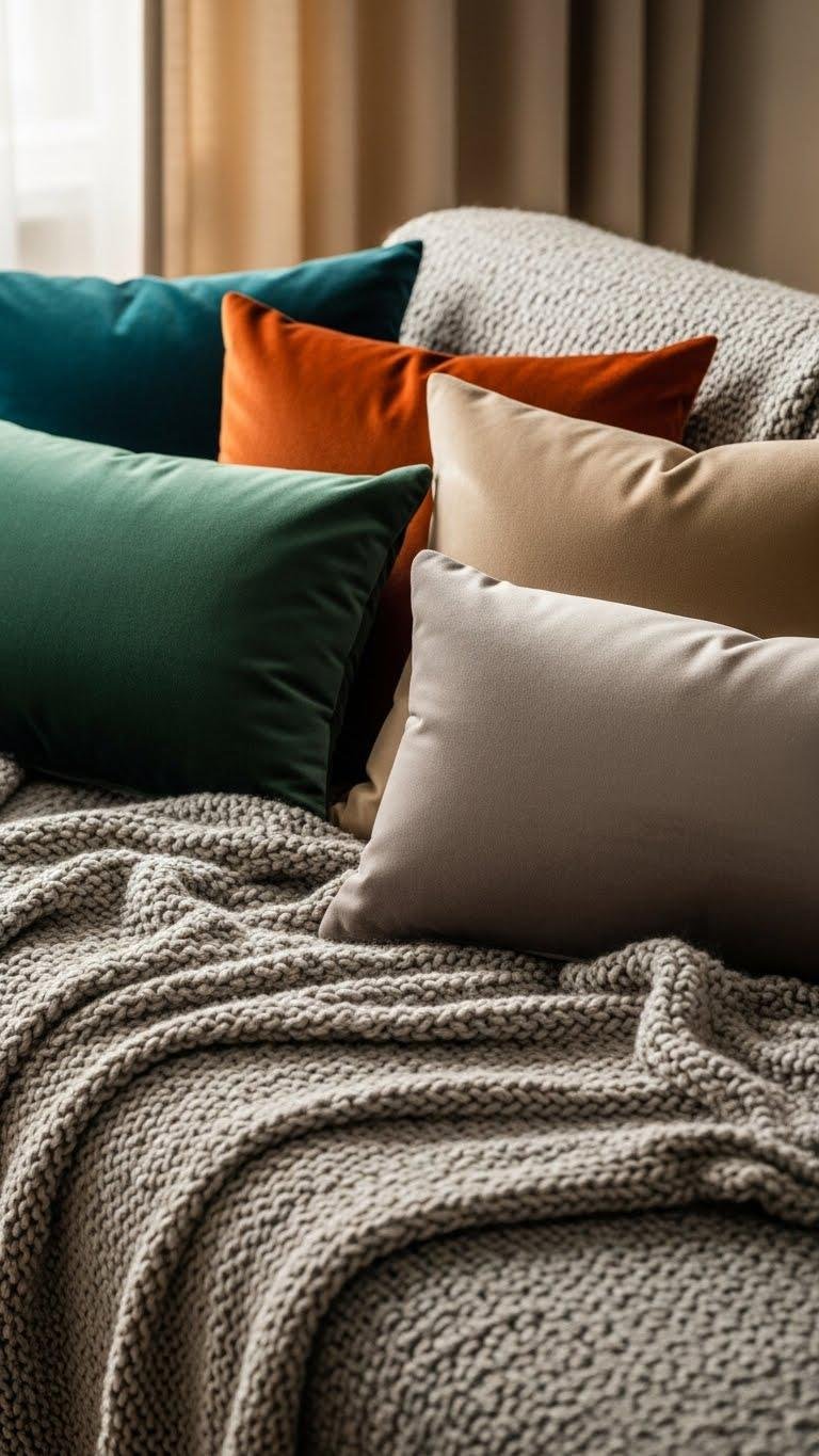 After you’ve layered a chunky knit blanket for warmth and texture, add soft velvet cushions to bring a refined tactile contrast. You’ll choose cushions that invite touch and express freedom—mix saturated hues with neutrals, mindful of color pairing to balance energy. Tend to velvet maintenance: brush gently, spot-clean, air regularly. Place cushions deliberately to create relaxed, confident comfort.