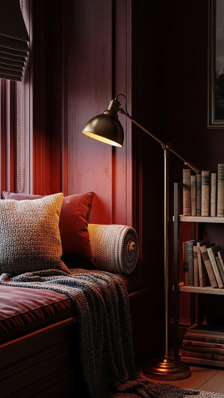 Think velvet and weathered wood: paint a compact corner in a deep, moody burgundy to cocoon your reading spot and dial down visual noise. You’ll add a plush windowseat layered with textured throws, a vintage lampstand casting amber pools, and a slim shelf for battered favorites. Keep accessories intentional, tactile, and minimal so the nook feels liberated, private, and utterly yours.