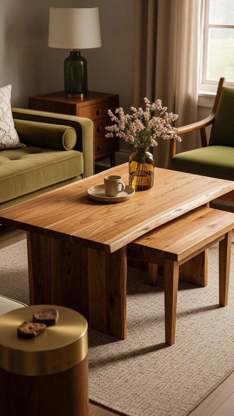 Anchored in the center of your nook, a solid wood coffee table gives the space organic grounding and a tactile counterpoint to velvet and brass. Choose reclaimed timber with a live edge for character, or opt for nesting tables to flex the layout. Rounded corners keep movement safe and relaxed.
