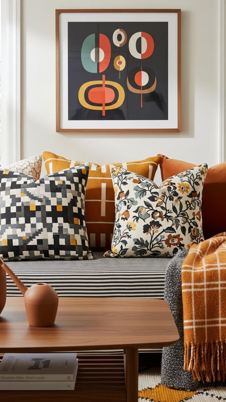Once your framed art has set the tone, bring that same intent to textiles and surfaces by mixing patterns and textures with purpose.
