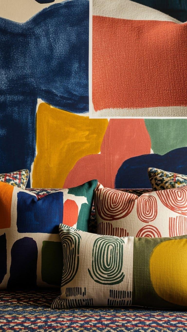 Choose mural inspired covers in weighty linen or velvet, and mix scales: bold abstracts with subtle artisan blockprints.