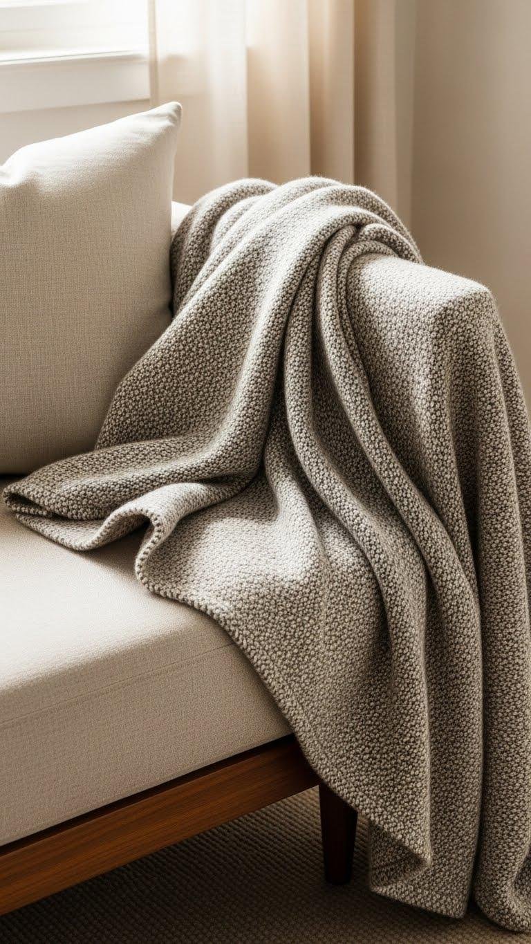 Frequently, draping a throw over a sofa arm instantly softens the room and invites touch—choose a blanket with a weighty weave or plush texture so it falls with effortless, sculpted folds that suggest use without looking sloppy. You’ll favor linen textures for a breathable, lived-in look; fold neatly for armrest protection, letting corners cascade casually to signal relaxed confidence and true comfort.