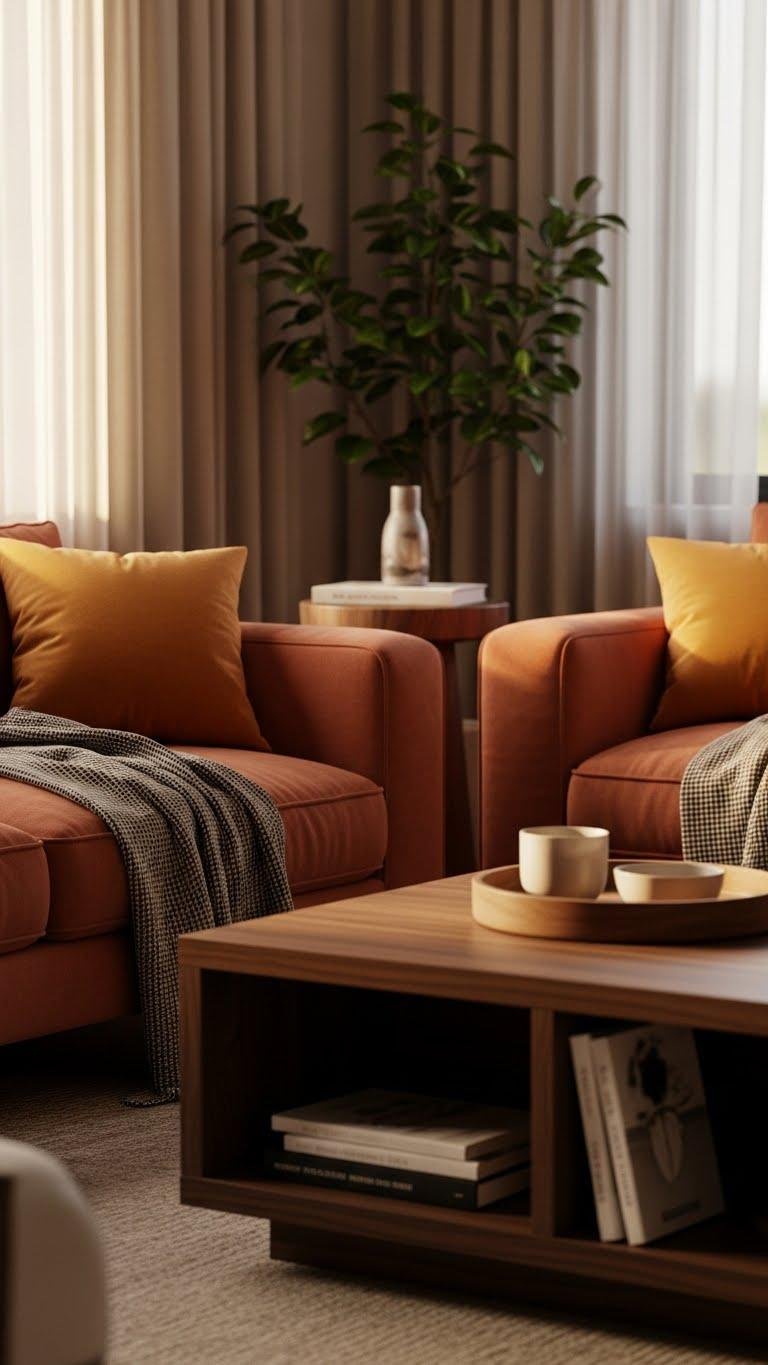 Because warm earth tones anchor a room, choose a palette of terracotta, ochre, and walnut to make your space feel grounded and inviting.