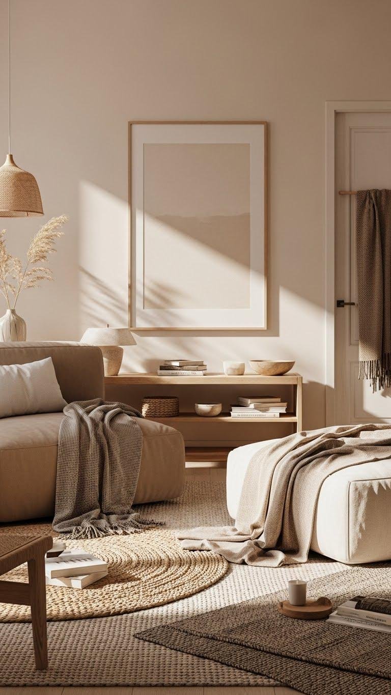 Start with a soft, warm neutral palette—think creamy beige, muted taupe, and sand-toned whites—to anchor your space and let texture do the talking.