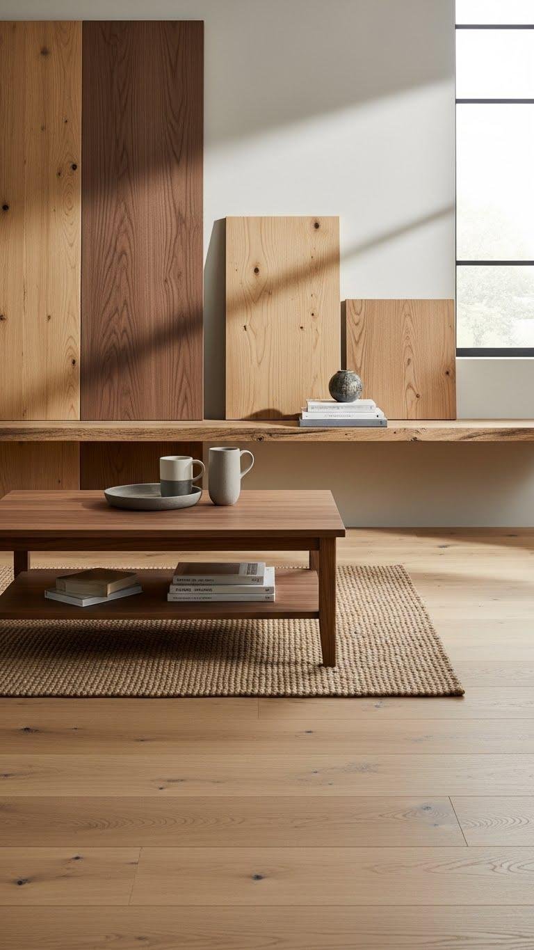 Layer natural wood textures to add warmth and quiet depth—mix light oak floors with a mid-tone walnut coffee table and a reclaimed pine shelf so each grain reads against the next. You’ll lean into unfinished timber accents and woven rugs, letting contrasting grains create rhythm. Keep finishes matte, hardware minimal, and let natural variation guide placement so spaces feel open, grounded, and effortlessly yours.