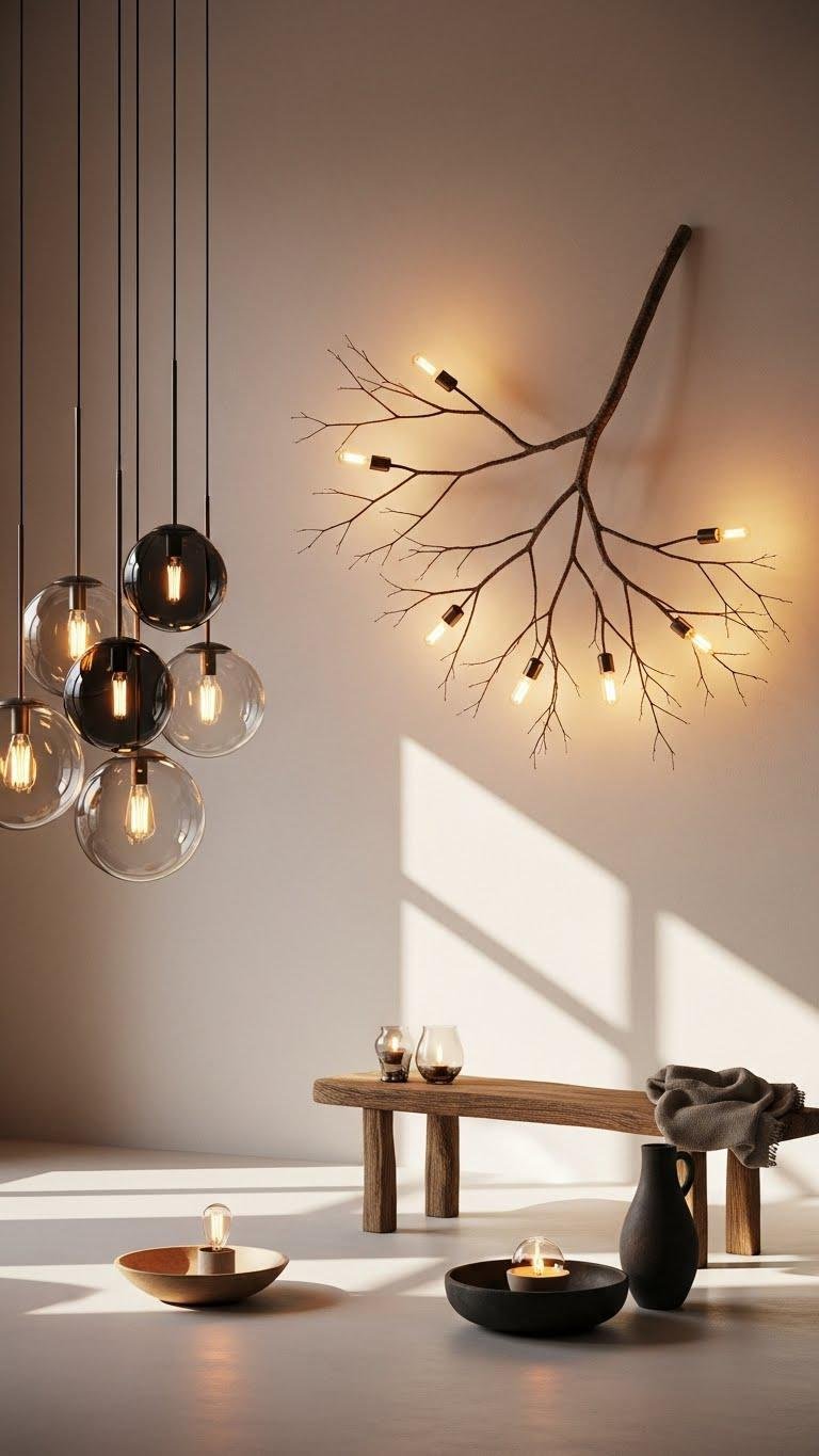 Anchor your warm-minimal scheme with glass globe and branch lighting that reads like functional sculpture—think clusters of clear or slightly smoked globes suspended from slim, dark stems or a single organic branch fixture that fans light across the room. You’ll choose suspended filament bulbs to glow softly, celebrate branch silhouettes against plaster, and keep forms airy so the space feels open, calm, and free.