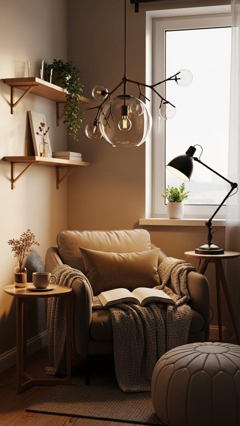 Often the coziest reading nooks feel deliberately small — a plush armchair tucked beside a window or beneath your glass globe and branch lighting, layered with a soft throw and a slim side table for your mug and current book.