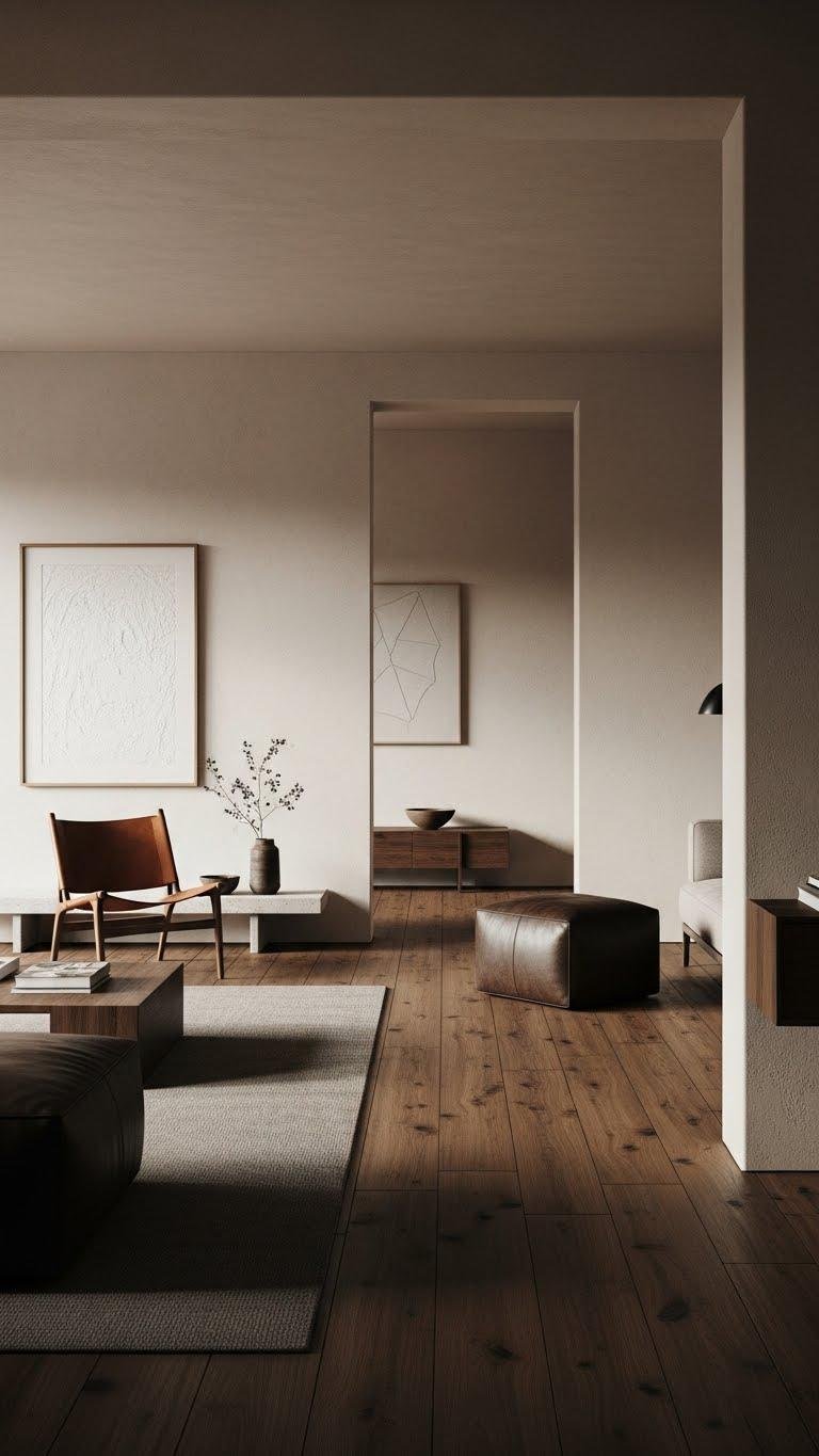 After you rotate a few small artworks to refresh the walls, extend that same sense of calm by pairing soft whites with deep browns throughout the room. Let rich contrasts guide surfaces: warm plaster, dark wood floors, and low-profile furniture.