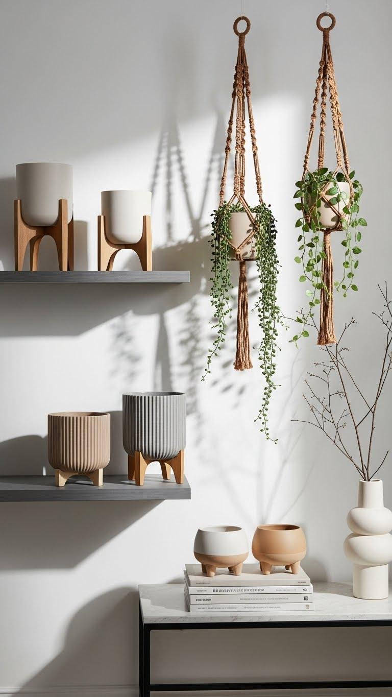 Bring in plants in sculptural pots to lift the room’s quiet geometry—choose vessels with clean silhouettes and tactile finishes that read as art as much as planters. You’ll balance form and function with air purifying succulents in matte ceramic stands, low-maintenance foliage in ribbed stoneware, and breezy hanging macramé pots for height. Let greenery feel intentional, freeing, and visually bold without clutter.