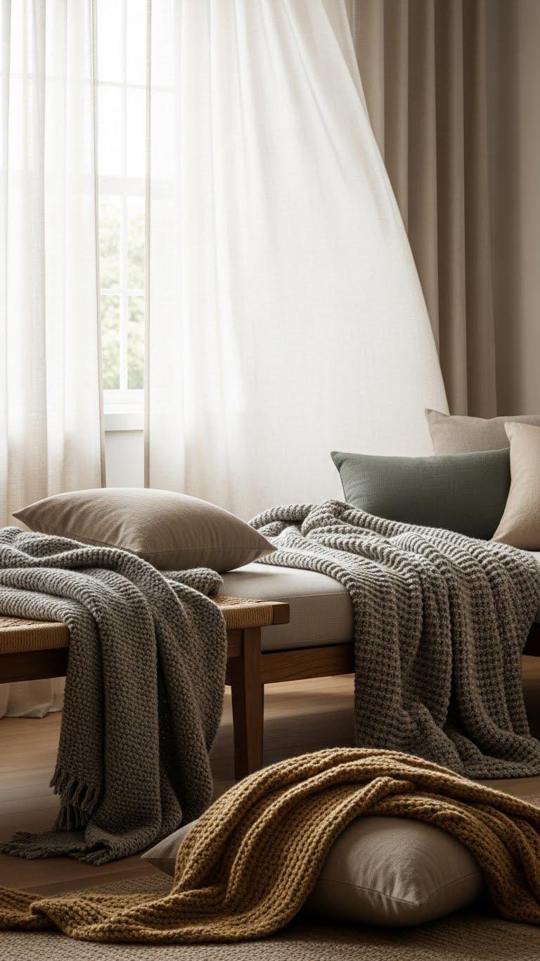 You’ll layer linen curtains for light, use wool throws for texture, and pick muted, natural tones.