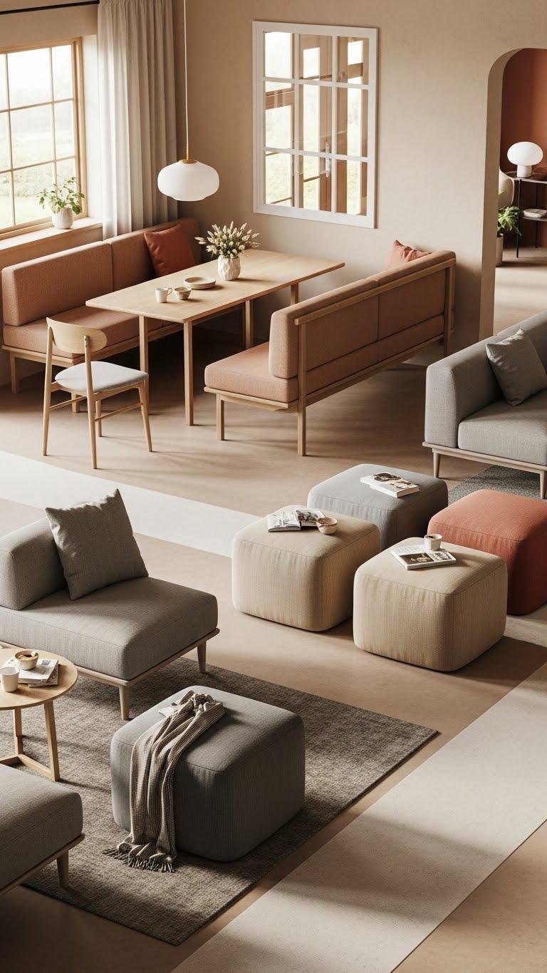Choose warm textures, muted tones, and simple silhouettes that let you shift layouts without fuss and keep freedom at the center.