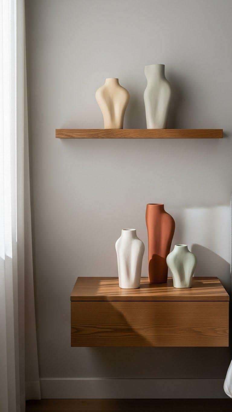 Bring in a few sculptural ceramic vases to anchor surfaces and introduce quiet, organic form. Choose pieces with matte glaze and asymmetrical silhouettes to create subtle movement without clutter. Place them solo or in sparse groupings on consoles, shelves, or bedside tables.