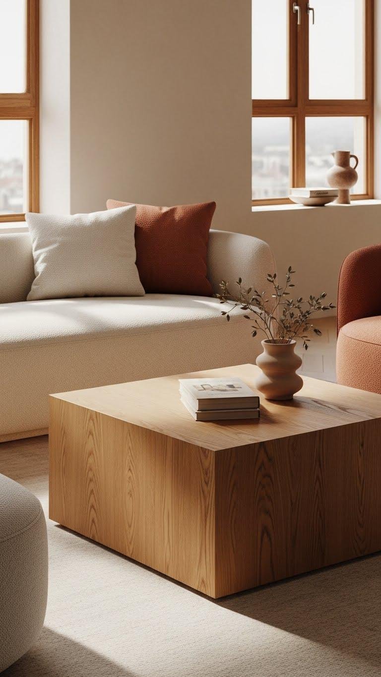 While rounded sofas invite you to sink into soft, embracing shapes, pairing them with square timber tables gives the room a crisp counterpoint that keeps the look grounded and modern.